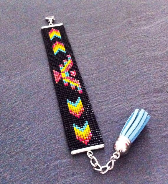 Bracelet Manchette Native American Aigle par TDFTheDreamFactory, €22.00 Perles de rocaille, Miyuki, noir, orange, turquoise, rouge, jaune.