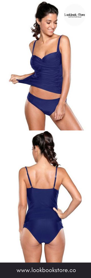 Swim Trends // Achieve simplicity plus sophisticated when you wear this blue ruched tankini set. Check it out.