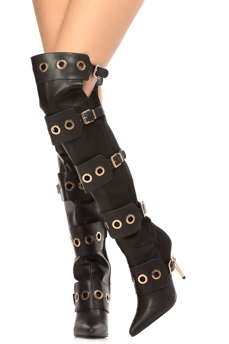 Black Faux Leather Ring Detailed Pointed Toe Thigh High Boots @ Cicihot Boots Catalog:women's winter boots,leather thigh high boots,black platform knee high boots,over the knee boots,Go Go boots,cowgirl boots,gladiator boots,skirt boots.