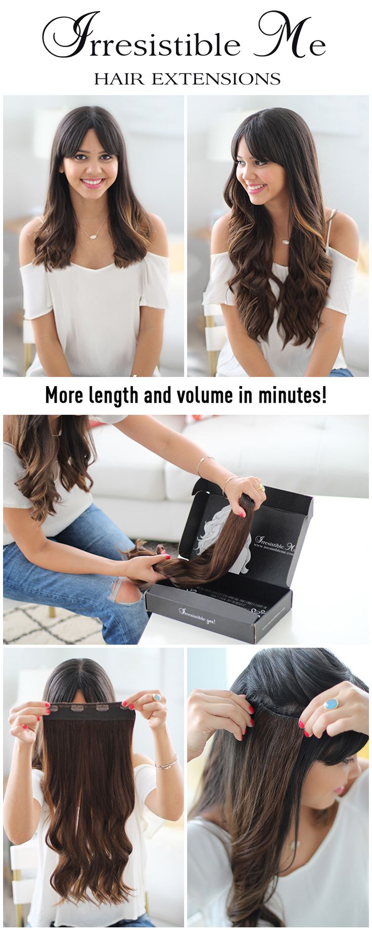 Make a dramatic hairstyle change with Irresistible Me 100% human Remy clip-in hair extensions. You can add instant length and volume to your hair by just clipping them in. Can be cut, dyed and heat styled. Great selection of colors. You can choose the length and weight. Free returns and exchanges, worldwide delivery. Fill in our fun quiz to get options tailored for your style.