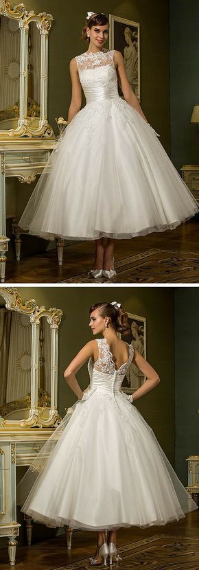 A vintage-inspired lace and tulle tea length wedding dress! Such a ladylike choice. It comes in white, ivory, champagne and blushing pink and can be made to your custom measurements. This adorable and affordable wedding dress has amazing reviews, too!
