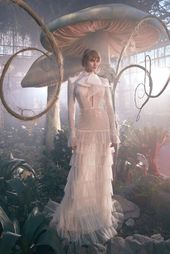 #GALA307 is a tailored A-line wedding dress with a structured sequinned top fastened at the neck with a dramatic sheer bow and a sheer tiered skirt made of pleated silk tulle ruffles. #aline #sequin #sheer