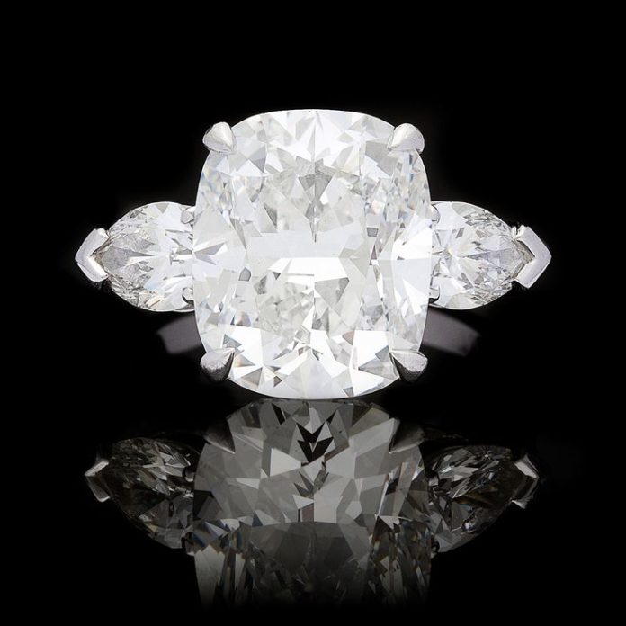 This Spectacular GRAFF 3-stone Platinum Diamond Ring features a center GIA 7.14 carat Cushion Cut Diamond flanked with a Pear Shape Diamond on each side totaling 1.40 carats. Stamped on the inside of the ring is the world renowned maker's name and the specifications of the ring. The band measures 2.0-2.5 mm in width and is currently a size 6.5, easily resized up or down. The total weight is 9.2 grams. This piece is accompanied by GIA report # 16417260 and original GRAFF valuation of t…