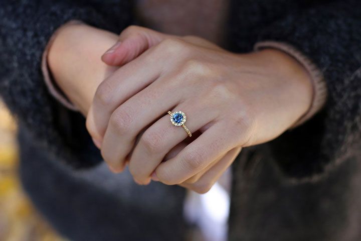 Montana Sapphire Engagement Rings by S. Kind & Co. ~ 0.76 carat blue Montana Sapphire halo ring surrounded by 22 hand set vintage diamonds, set in 18k recycled yellow gold