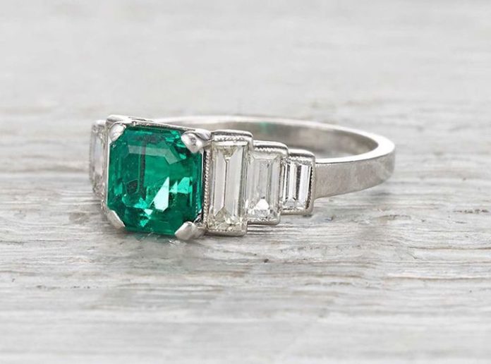 1.50 carat natural Colombian emerald, accented by six baguette cut diamonds, circa 1925 ~ we ❤ this! moncheribridals.com