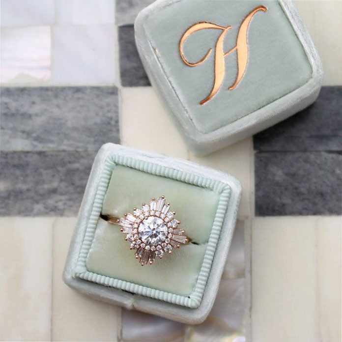 The Original Gatsby ~ The center stone is framed by a petite diamond halo. Outside the halo, alternating custom cut baguettes and round stones cascade at different levels, catching the eye from every angle.