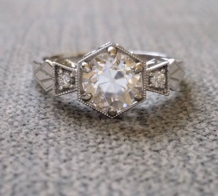 Vintage Inspired Engagement Rings by PenelliBelle ~ Art Deco meets Victorian Style ~ The Ellie features a 14K gold setting with low profile set with a 1 ct G-H in color old European cut moissanite and .08 ct of accent diamonds