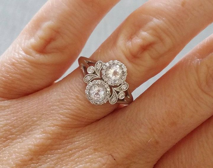 Vintage Inspired Engagement Rings by PenelliBelle ~ The Utopia features a 14K white gold setting, set with .40 ct white sapphire centers and .40 ct of diamonds.